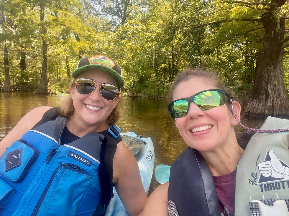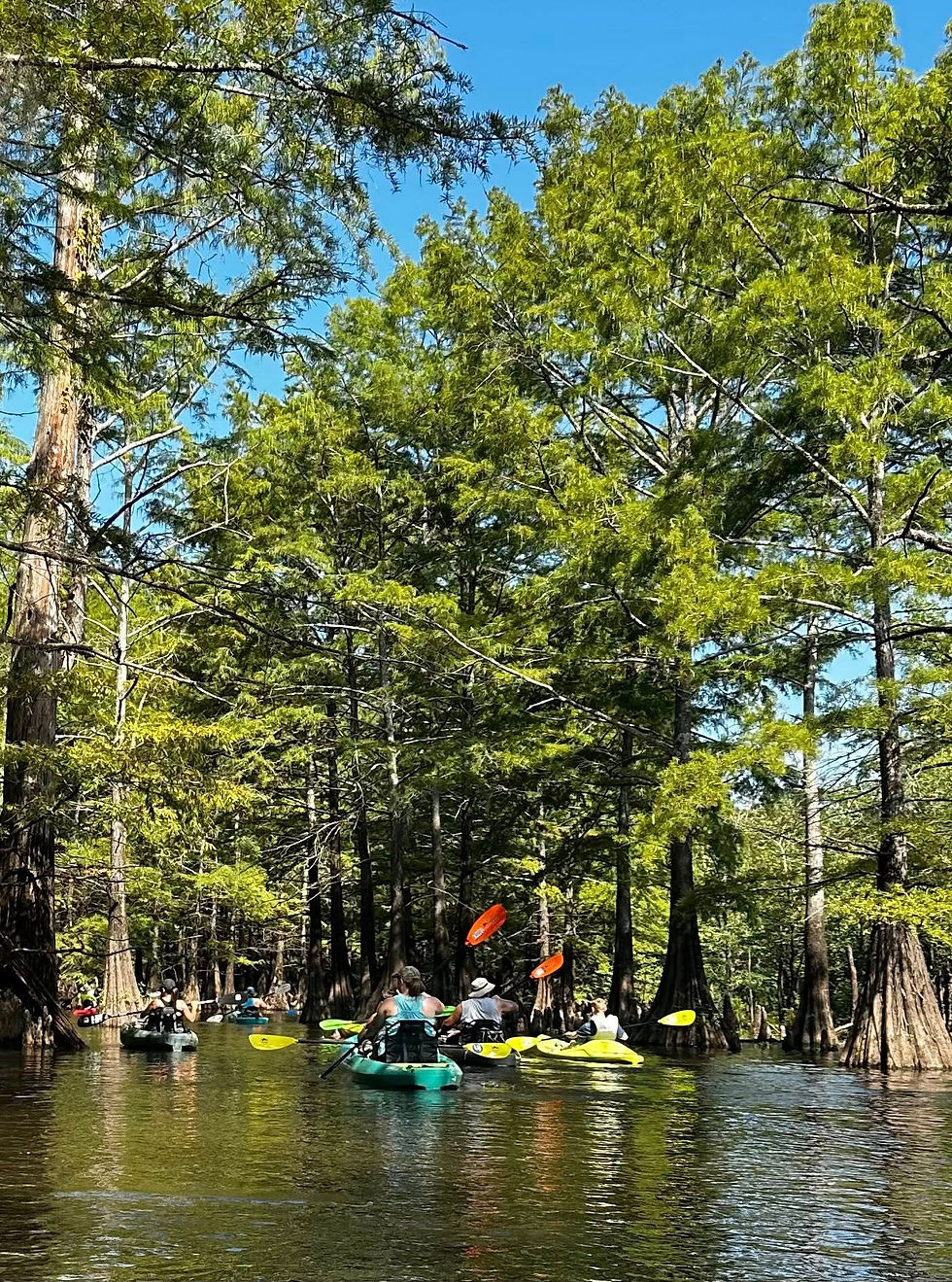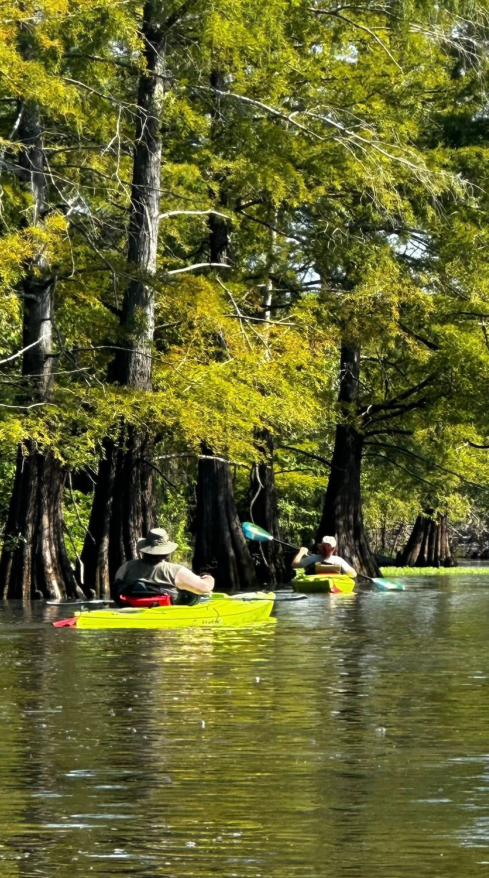 On what was not the hottest day of the year but sure felt like it, 23 paddlers set out in 22 kayaks to explore beautiful Harrell Lake in Louisiana’s Union Parish on Saturday, August 16th. The paddlers consisted of folks from BCOS as well as folks from the North Louisiana Kayaking club. Harrell Lake, which is part of the Upper Ouachita National Wildlife Refuge, is absolutely gorgeous. A few paddlers took advantage of the kayak launch available at the put-in. We paddled northwest up a branch of the lake called Dry Creek, winding our way through a myriad of Bald Cypress trees, and we were grateful for the shade they provided. We went as far as we could go up Dry Creek before the water became too shallow and the cypress knees too many, prompting us to turn around and head back to the main lake. As it turns out, “Dry Creek” is anything but dry, according to Keith’s grandson who tumped out of his boat! Little Griffin reports that the cool lake water felt refreshing, and his grandad got to break out the bilge pump he brought along for such an occasion. We continued our paddle north up Harrell Lake for another mile or so before turning around and heading back to the launch area. On the way back, Mark Robinson caught an impressive largemouth bass with his Snoopy fishing rod! Who knew that little kiddie rod & reel could reel in such a great catch?! Saturday’s nearly 4-mile scenic paddle provided us all a generous dose of sunshine and camaraderie on the water. Afterwards, several paddlers went to the Creamery in West Monroe for lunch and ice cream to cool down. A big thank you to Steve Birmingham for planning and leading the paddle.